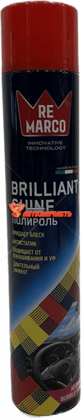Полироль для пластика салона RE MARCO Brilliant Shine глянец, 750 мл, аэрозоль, бубль гум RM-808 используется для ухода за пластиковыми, деревянными и кожемитовыми деталями интерьера автомобиля. Средство изготовлено на основе силикона, придает поверхностям эффектный глянцевый блеск, сохраняющийся длительное время. Продукт защищает детали от преждевременного износа, придает им антистатические свойства, что препятствует оседанию пыли. Полироль удобно наносится, имеет экономичный расход.