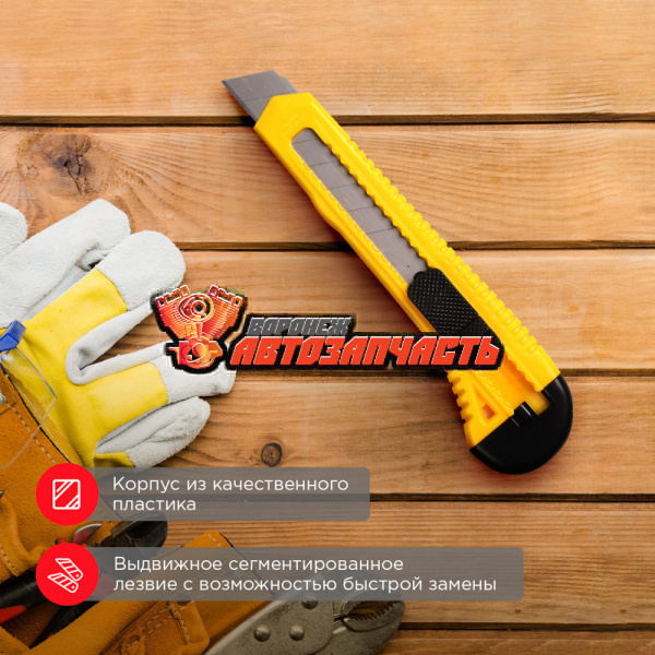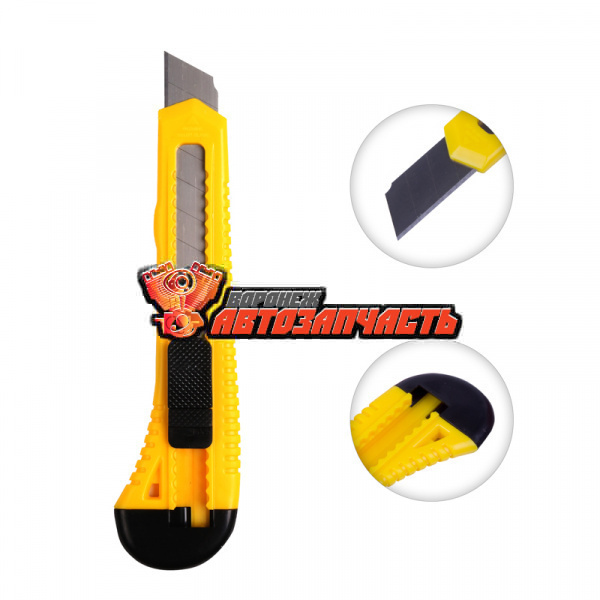 Корпус ножа выполнен из пластика. Сегментированное лезвие шириной 18 мм изготовлено из высококачественной инструментальной стали. Когда крайний сегмент затупляется, его можно отломить и продолжить использование инструмента.