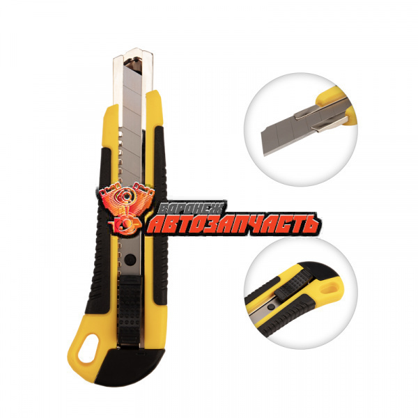 Лезвие шириной 18 мм изготовлено из высококачественной инструментальной стали, фиксируется автоматически. Когда крайний сегмент затупляется, его можно отломить и продолжить использовать инструмент.