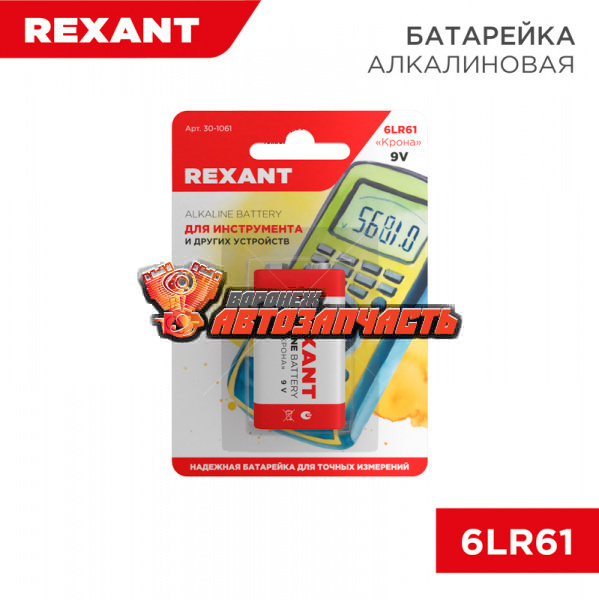 Алкалиновая батарейка 6LR61 («Крона») REXANT 1 шт. в блистерной упаковке.