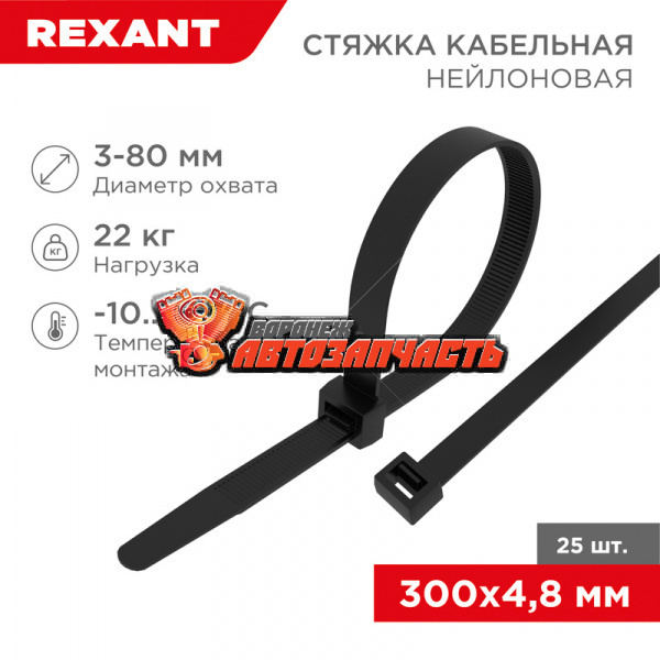 Стяжка нейлоновая 300x4,8мм, черная (25 шт/уп) REXANT